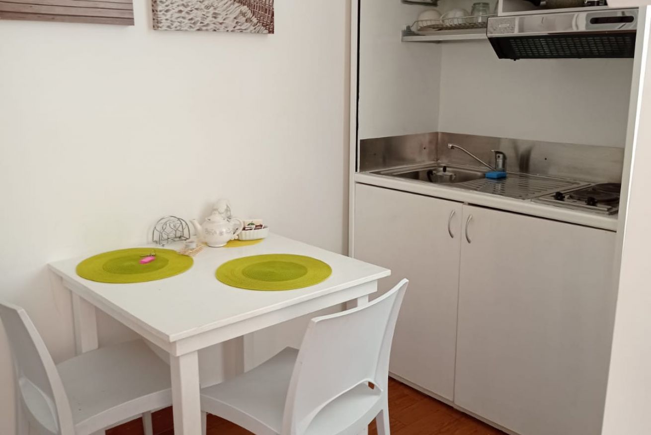Ampio mini appartamento soppalcato. Nella parte superiore letto matrimoniale, armadio a giorno, smart tv, aria condizionata freddo/caldo e wi-fi veloce. Nella parte angolo cottura, tavolino con sedie, frigorifero, bagno completo con box doccia. L'affaccio è su un cortile interno tranquillo.